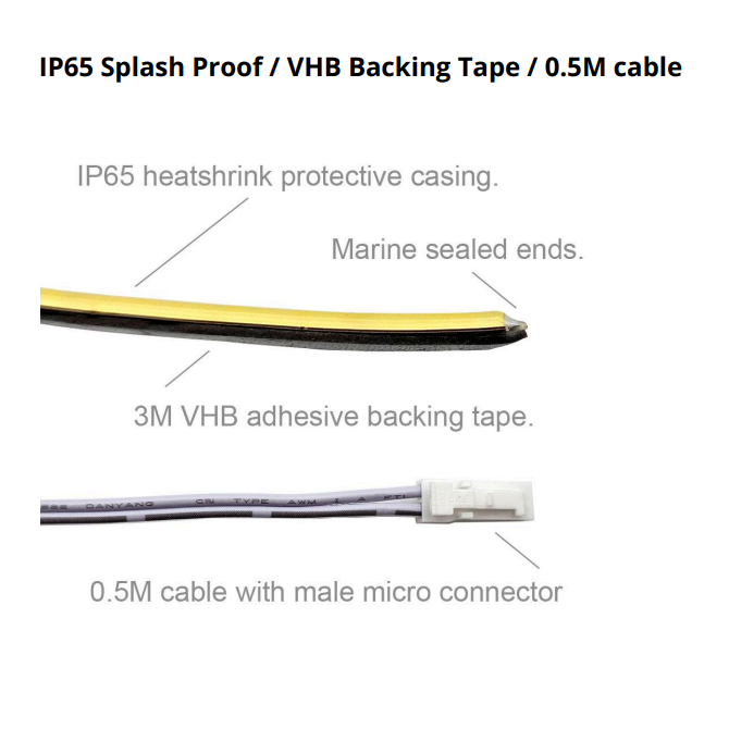 The LED strip is only 4mm wide and IP65 (splash proof) rated. This provides complete protection against solid items over 12.5mm like finger touch. LED strip lights with a IP65 rating are ideal for applications where the potential for liquid ingress is present.